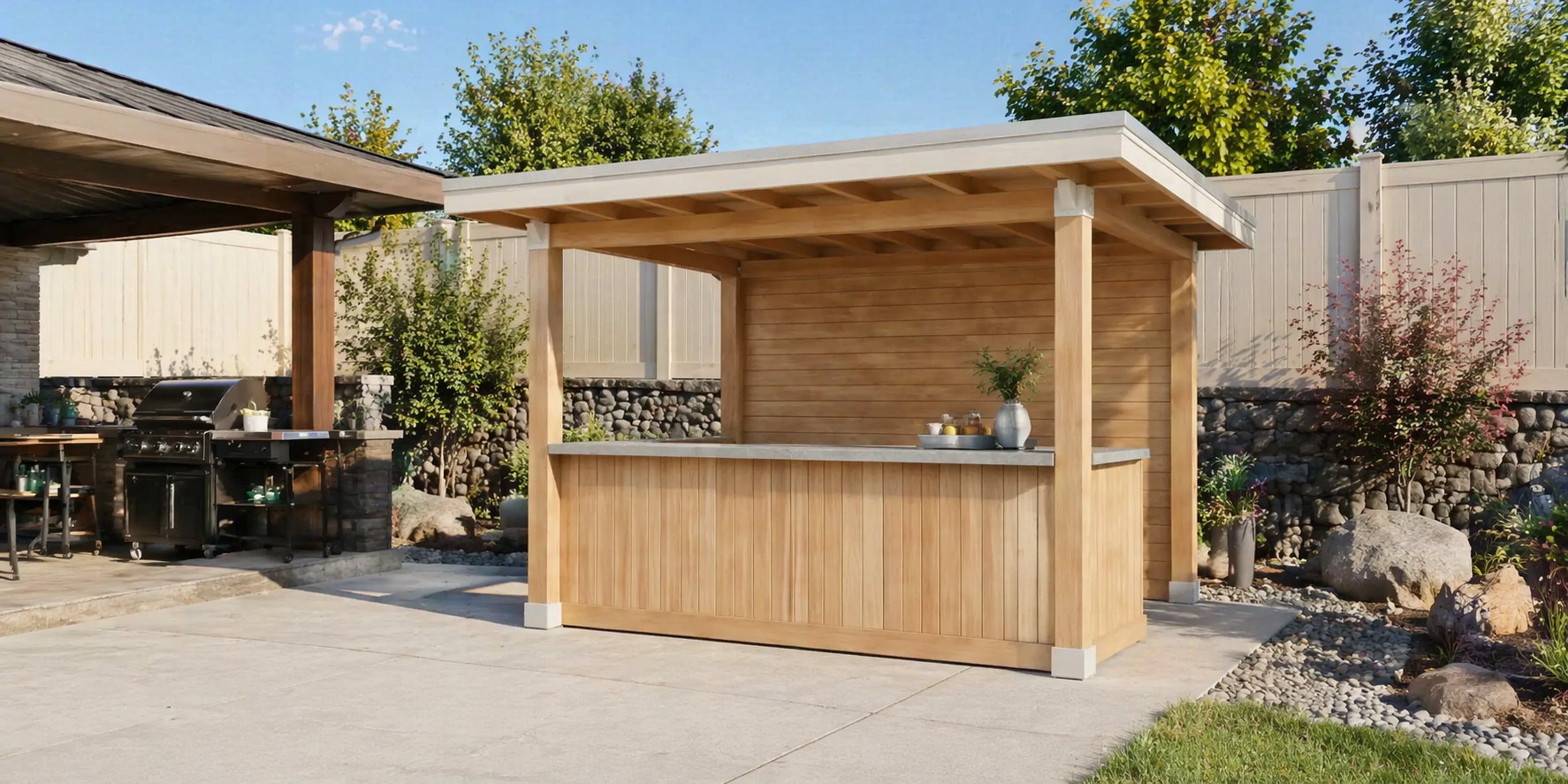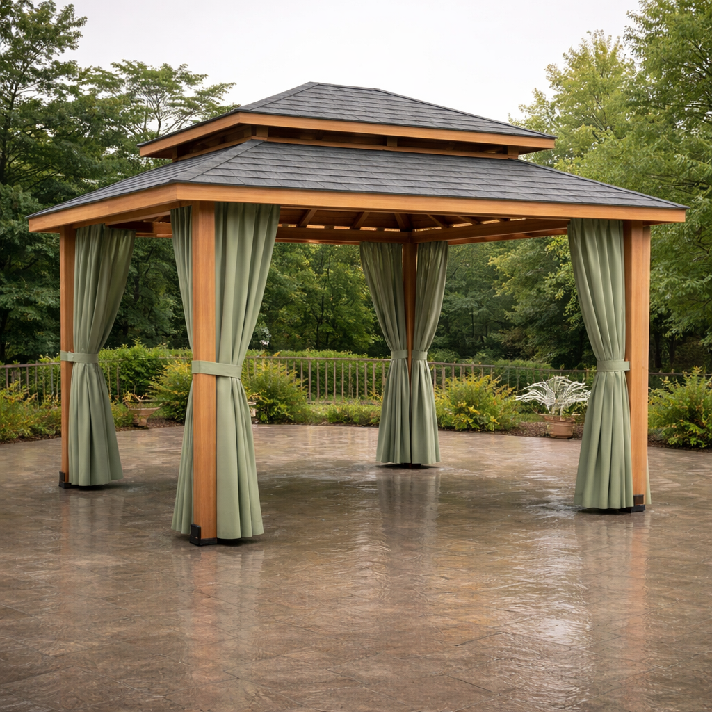 Pavillon holz mit asphalt dach und polyester vorhängen