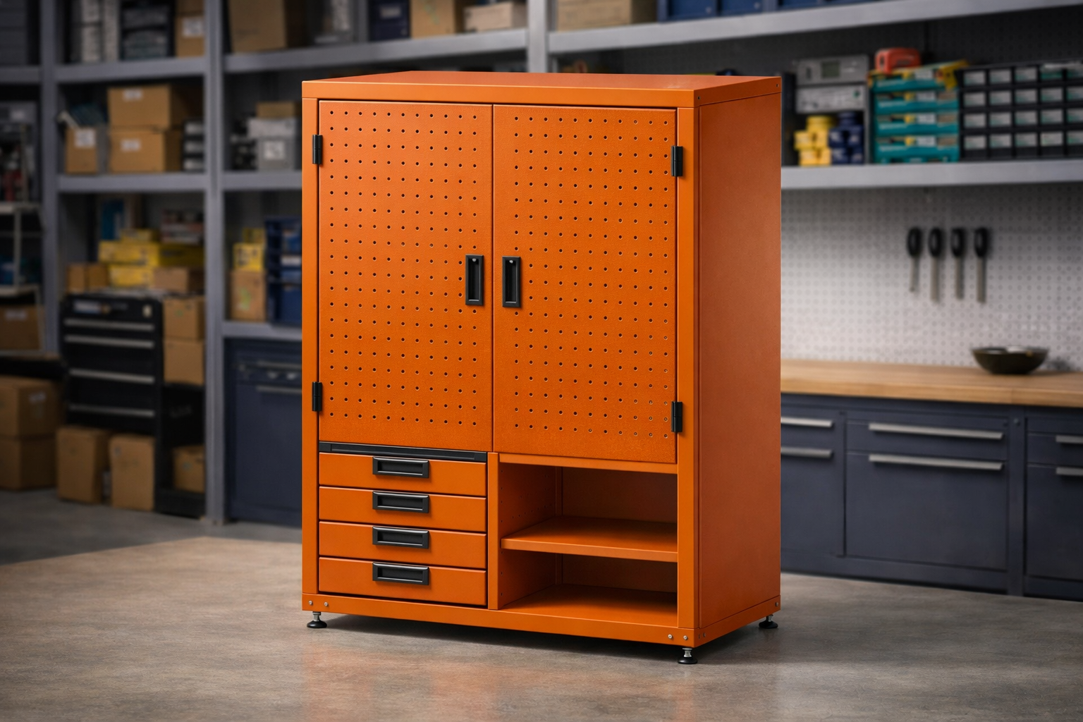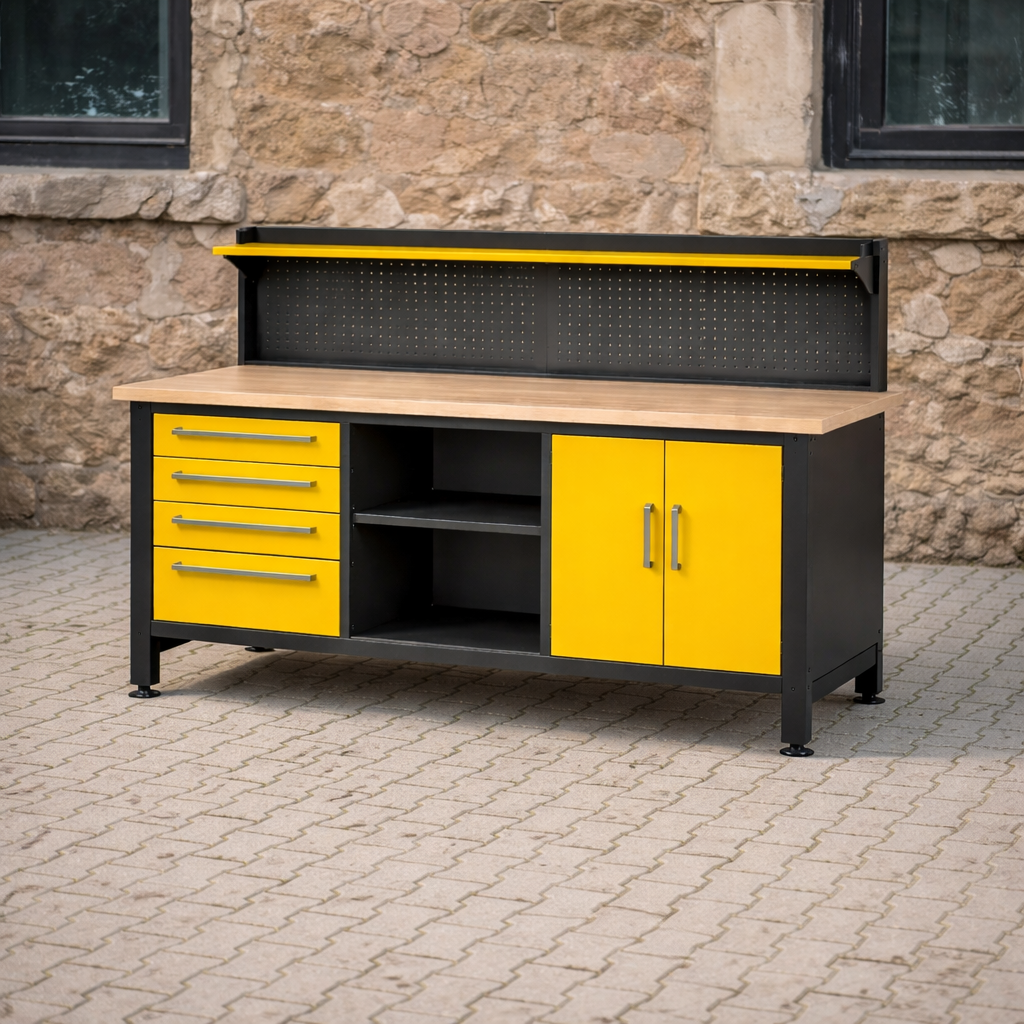 Werkbank metall und gummibaumholz mit schubladen und schränken schwarz gelb