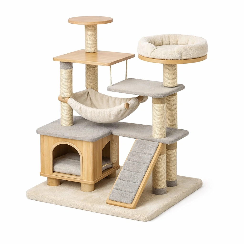 Kratzbaum aus holz und plüsch beige
