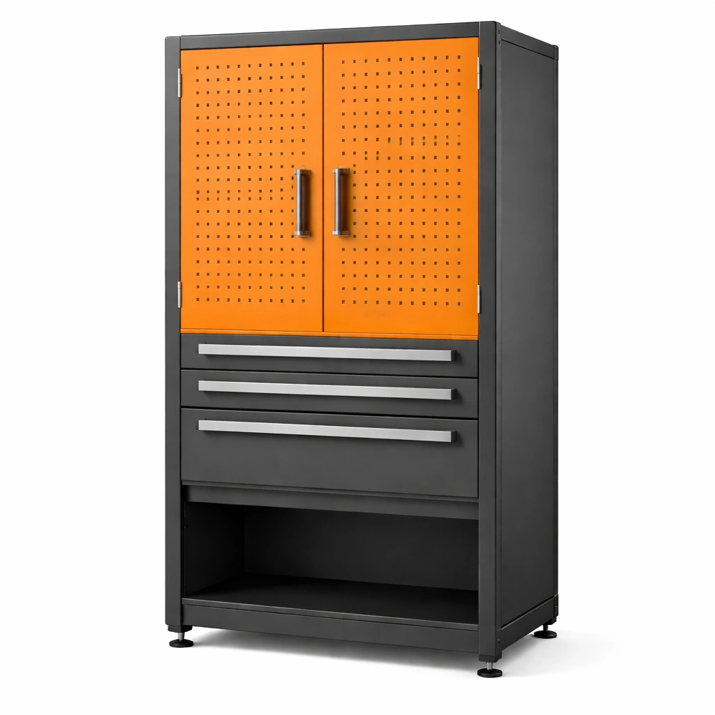 Werkzeugschrank stahl orange mit lochblechtüren und schubladen