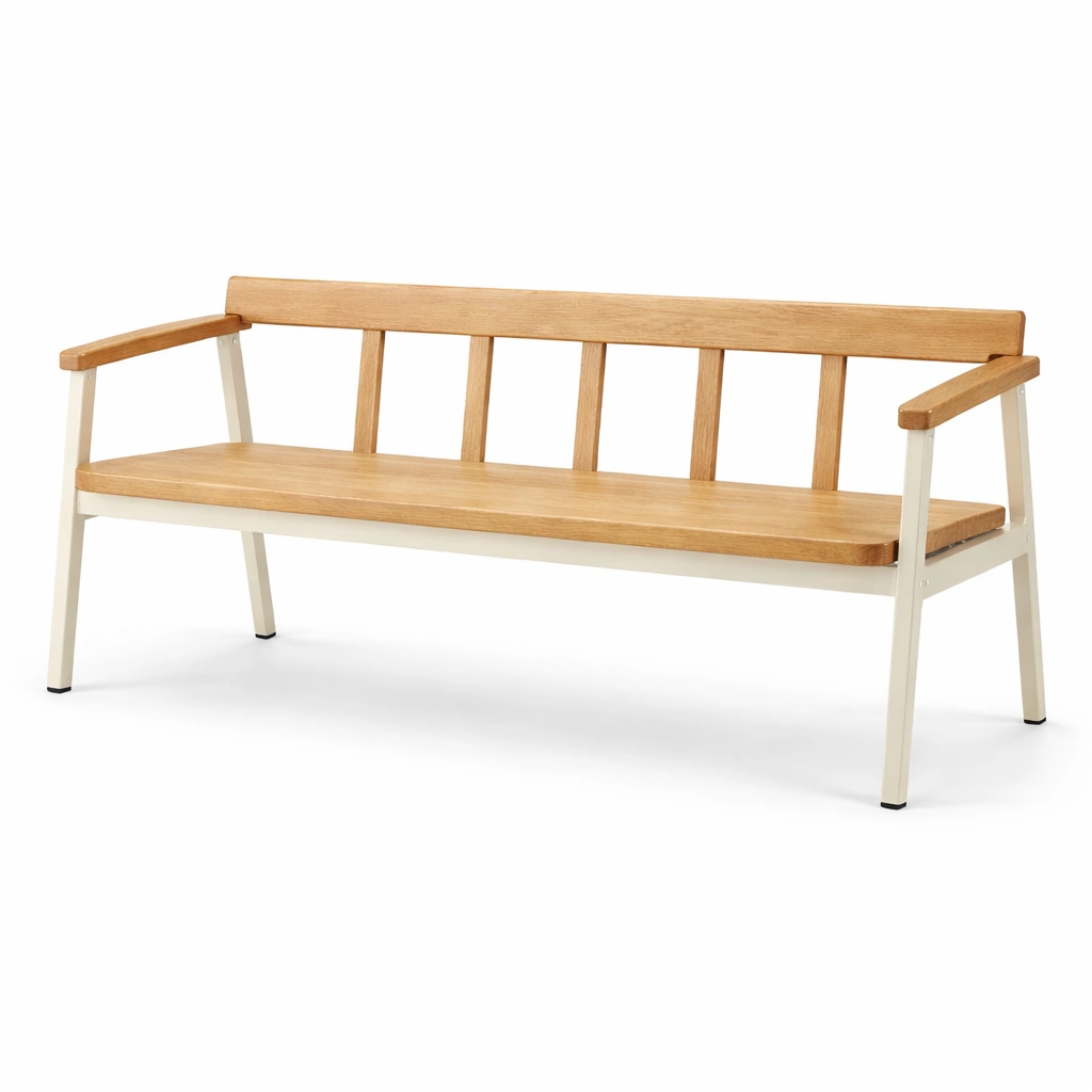 Diese Bank verfügt über eine Sitzfläche aus massiver Eiche und stabile Beine aus Stahl, geeignet für den Innen- oder Außenbereich.