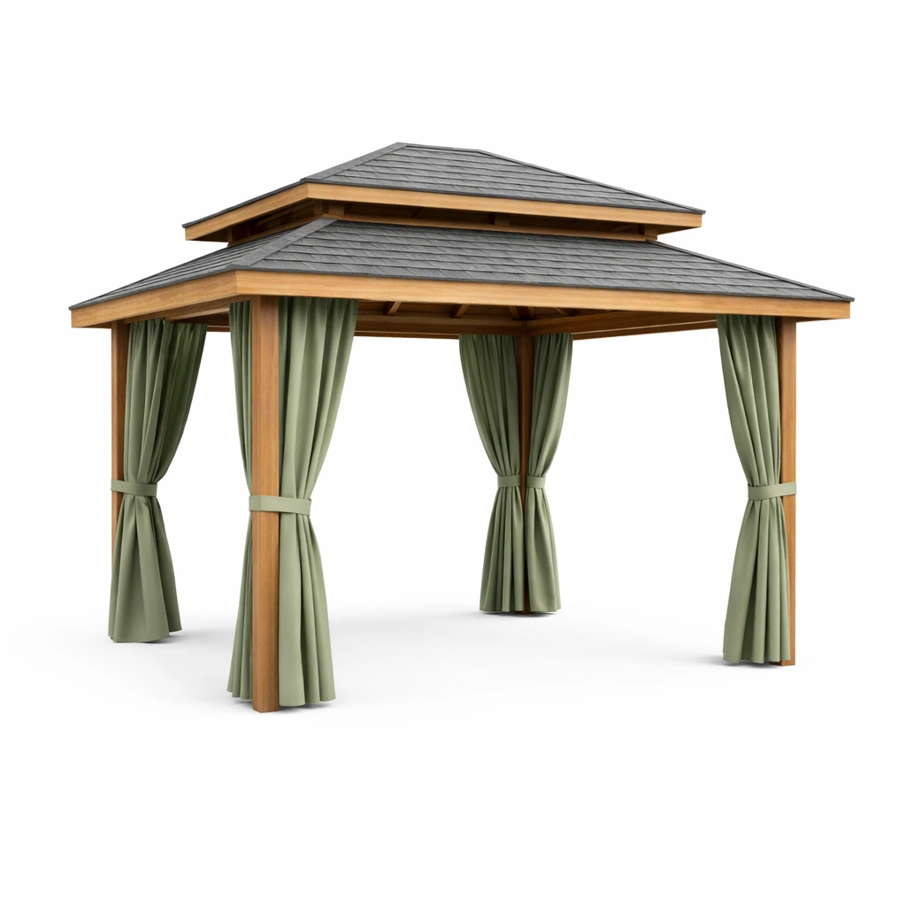 Material: Rahmen aus Holz, Dach aus Asphalt-Dachschindeln, Vorhänge aus Polyester